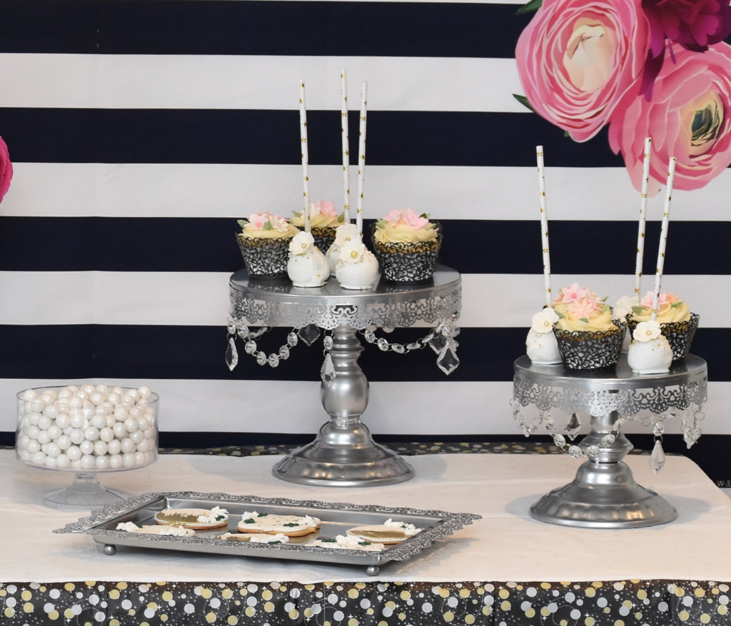 - 6 Piece Antique Metal Cake Stand Set with Crystal Pendants and Beads. Set includes: