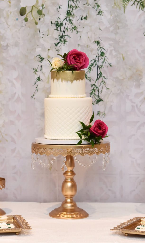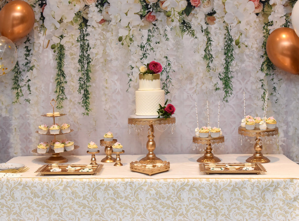 • Three tier square white plastic cupcake stands with gold handles ( Converted to two tier as shown in the picture) (x2)