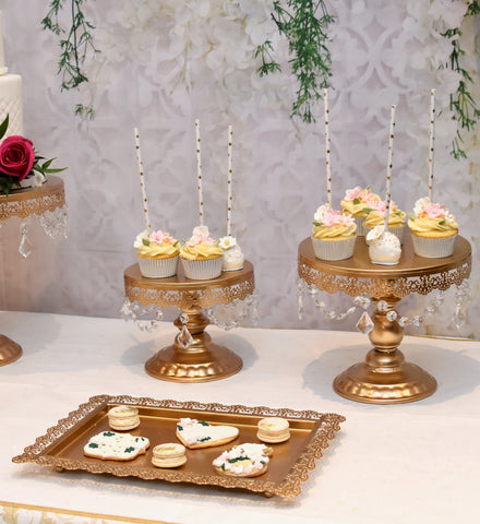 • 9 Piece Gold Antique Metal Cake Stand Set with Crystal Pendants and Beads. Set includes: